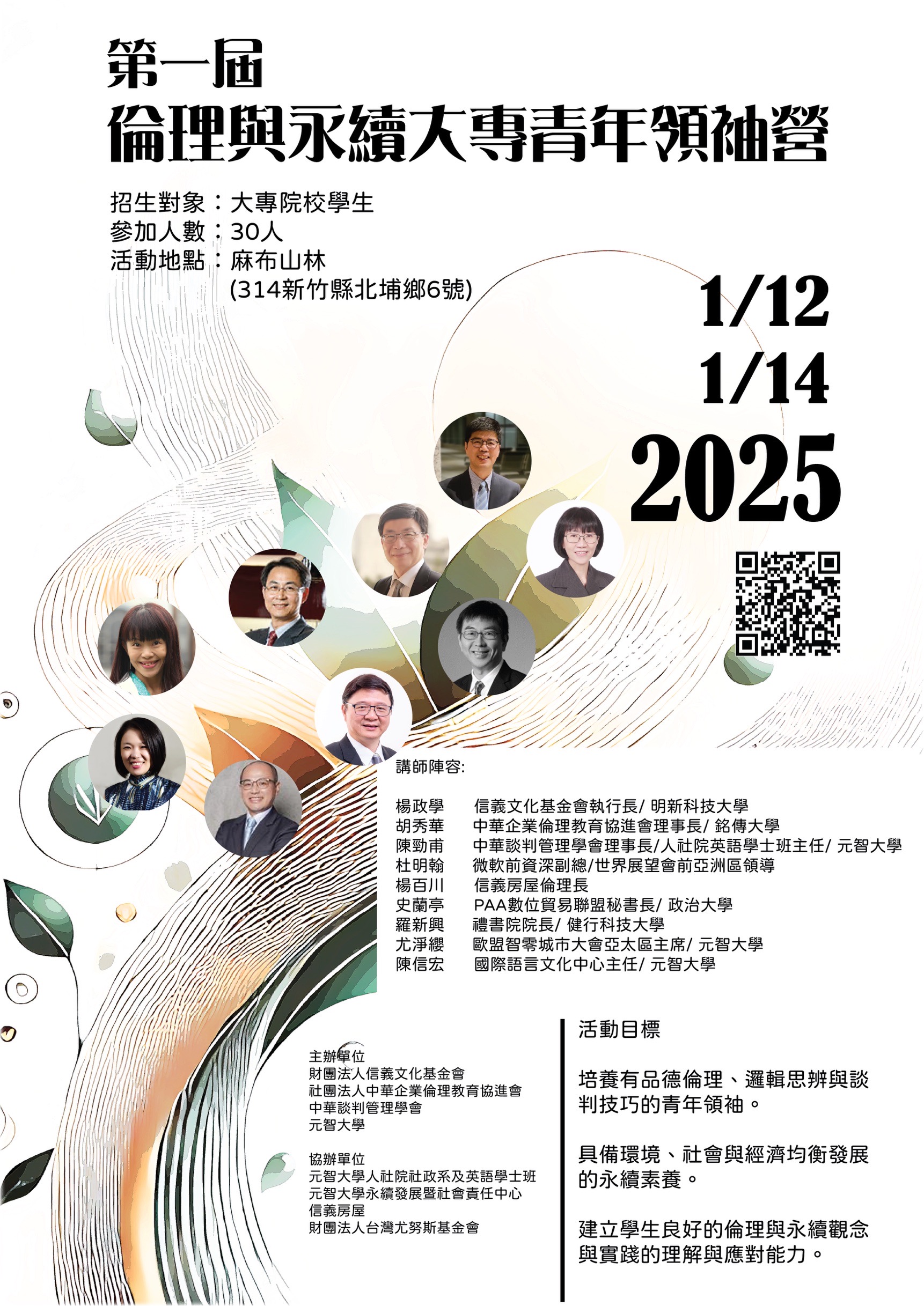 一、 為推廣與落實永續、倫理與談判觀念與實務於大專青年,2025年元智大學將承辦中華企業倫理教育協進會與中華談判管理學會委託之「2025第一屆倫理與永續大專領袖營」。致力於啟發下一代青年領袖,讓他們具備引領變革的勇氣與智慧,並擁抱永續與道德的核心價值。透過這三天的寓教於樂的課程與競賽,培養有品德倫理、邏輯思辨與談判技巧的青年領袖,使其具備環境、社會與經濟均衡發展的永續素養。最後由競賽的方式,來建立學生良好的倫理與永續觀念,促進倫理的實踐。