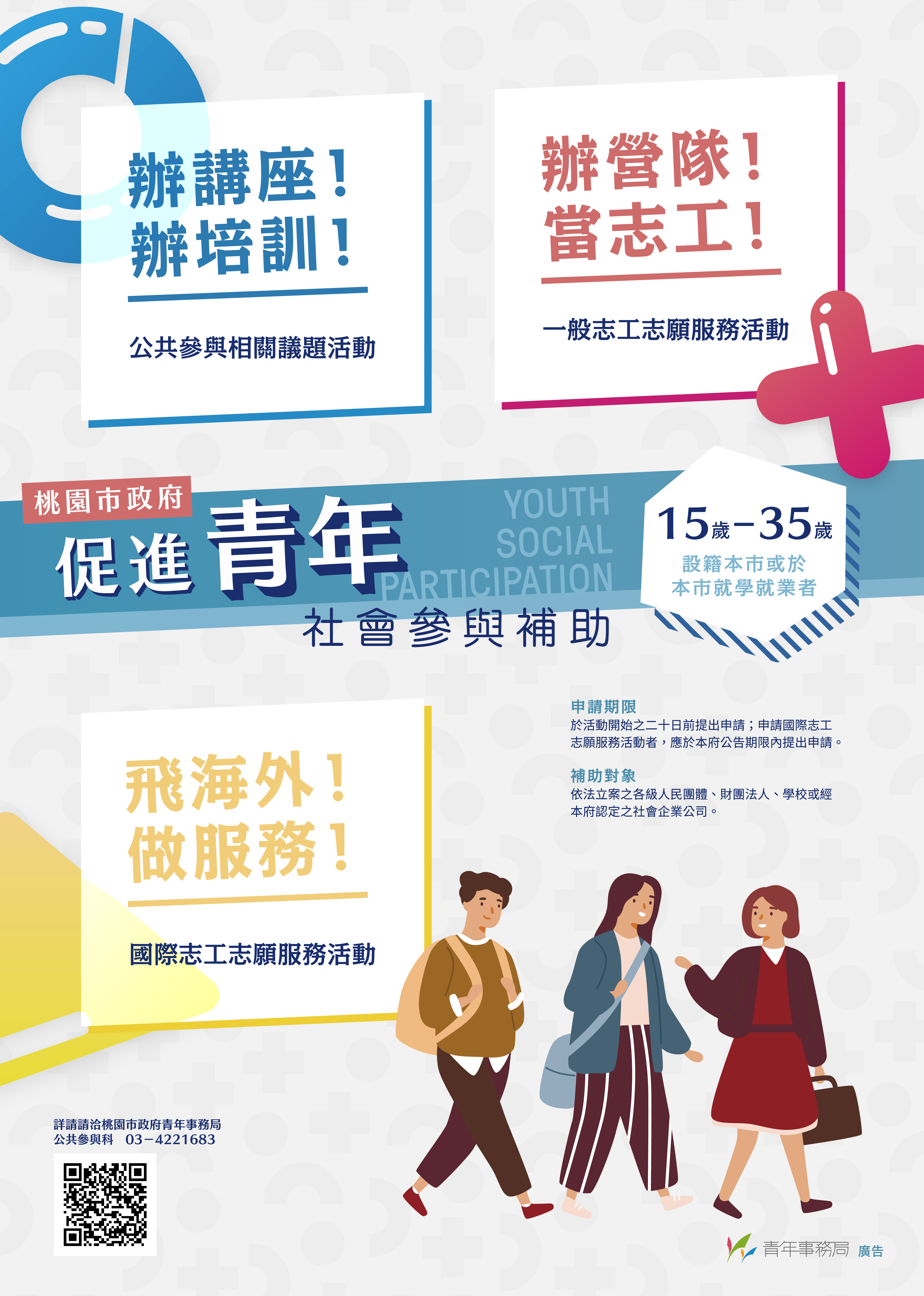 (二)另依「桃園市政府促進青年社會參與補助作業要點」,六人以上青年志工團隊,且團隊成員占人數二分之一以上,於桃園市推動教育、社區、環境、文化、科技、健康及其他各項志願服務工作皆可提出申請,申請方案依收件順序審核,補助款用罄即不再受理,相關補助規定聯繫窗口請洽桃園市政府青年事務局公共參與科王玟潔小姐(03-4225205分機6007)。
