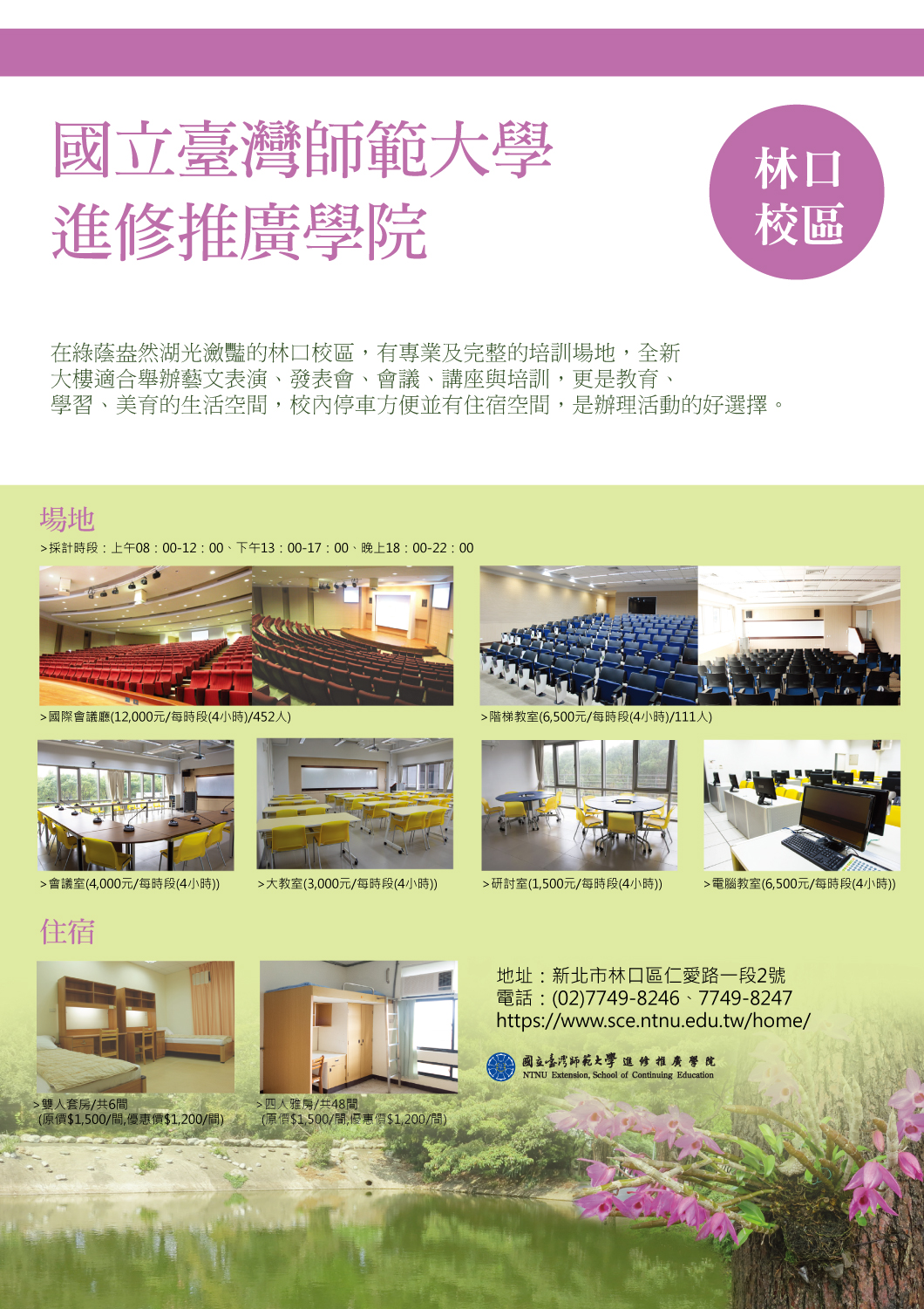 二、 優惠期間即日起至110年2月9日,相關訊息及預約方式請詳閱本校進修推廣學院網站住宿服務林口分館(https://www.sce.ntnu.edu.tw/home/accommodation/?LinKou)。