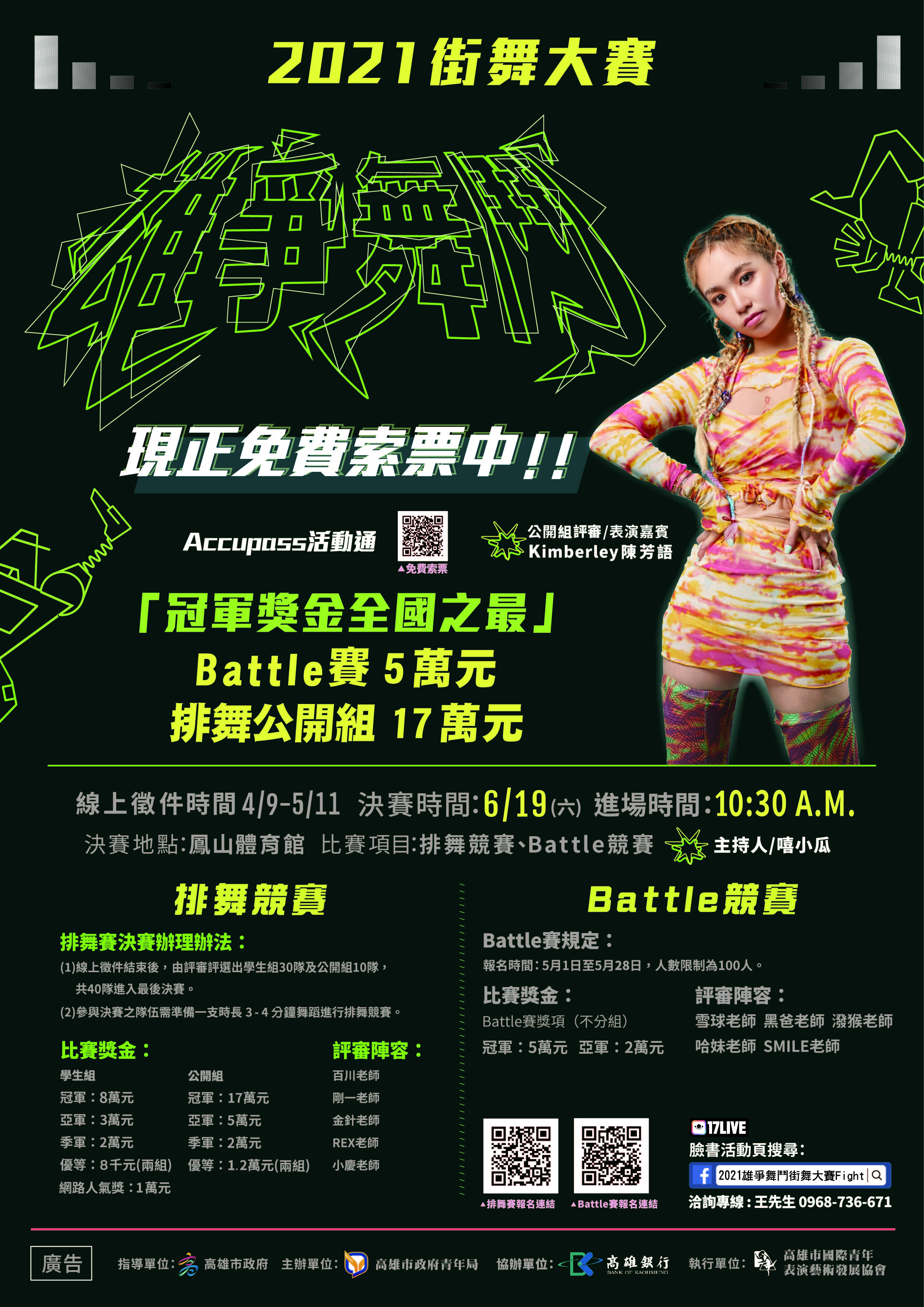 一、 為鼓勵全國青年透過街舞競賽挑戰自我,並藉此發掘高雄市表演藝術產業人才,本局特舉辦「2021 雄爭舞鬥街舞大賽」,相關競賽招生資訊業於4月初發函貴單位(含招生海報),惟為提升競賽隊伍知名度與本活動曝光度,新增相關細節規定,詳如新增規定簡章,惠請協助公告報名簡章及EDM於貴校或所屬單位官網及適合媒宣管道。