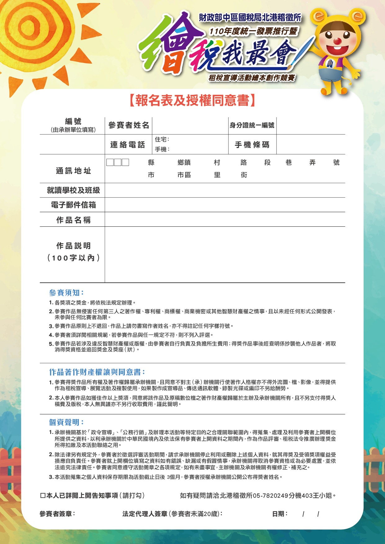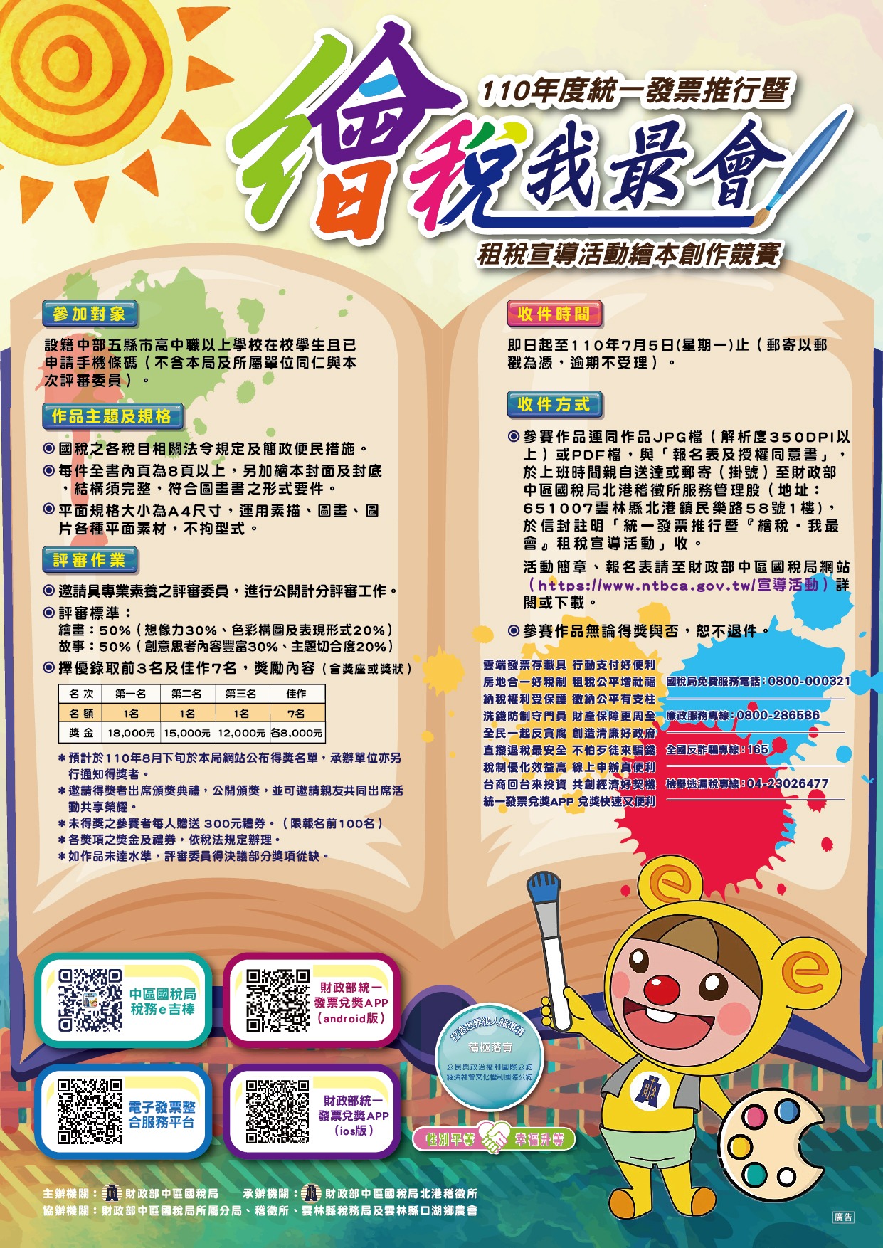 二、 旨揭「繪稅˙我最會」繪本創作競賽徵件截止日期為110年7月5日,活動簡章、報名表及授權同意書可至財政部中區國稅局網站(https://www.ntbca.gov.tw/宣導活動)詳閱或下載,另頒獎活動訂於110年10月3日(星期日)假雲林縣口湖鄉農會廣場舉行。