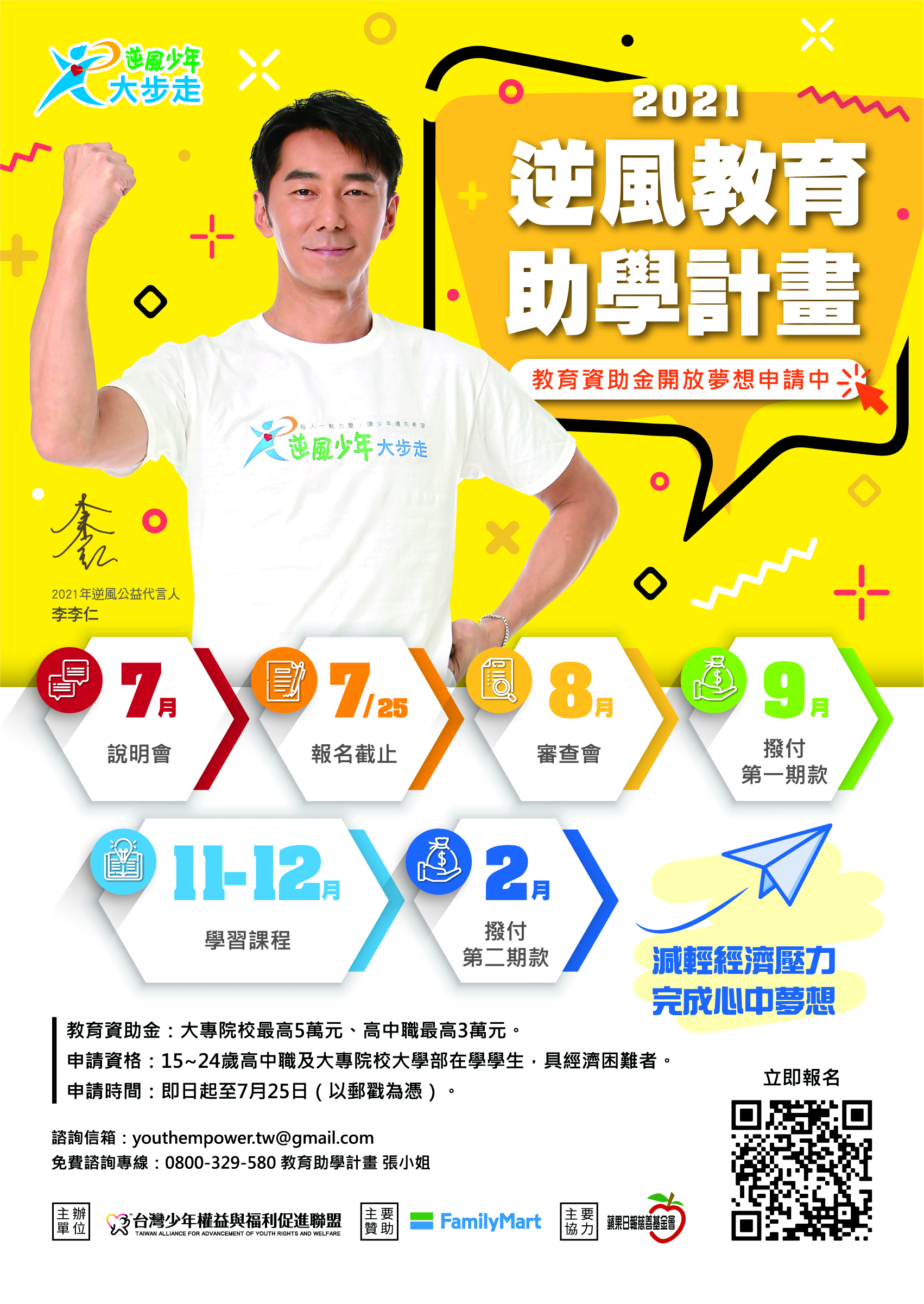 一、 本活動旨在協助15至24歲具經濟困難者之高中職及大專院校大學部在學學生,透過申請計劃,獲得教育資助金減輕經濟壓力,並勇於追求夢想、實現自我。
