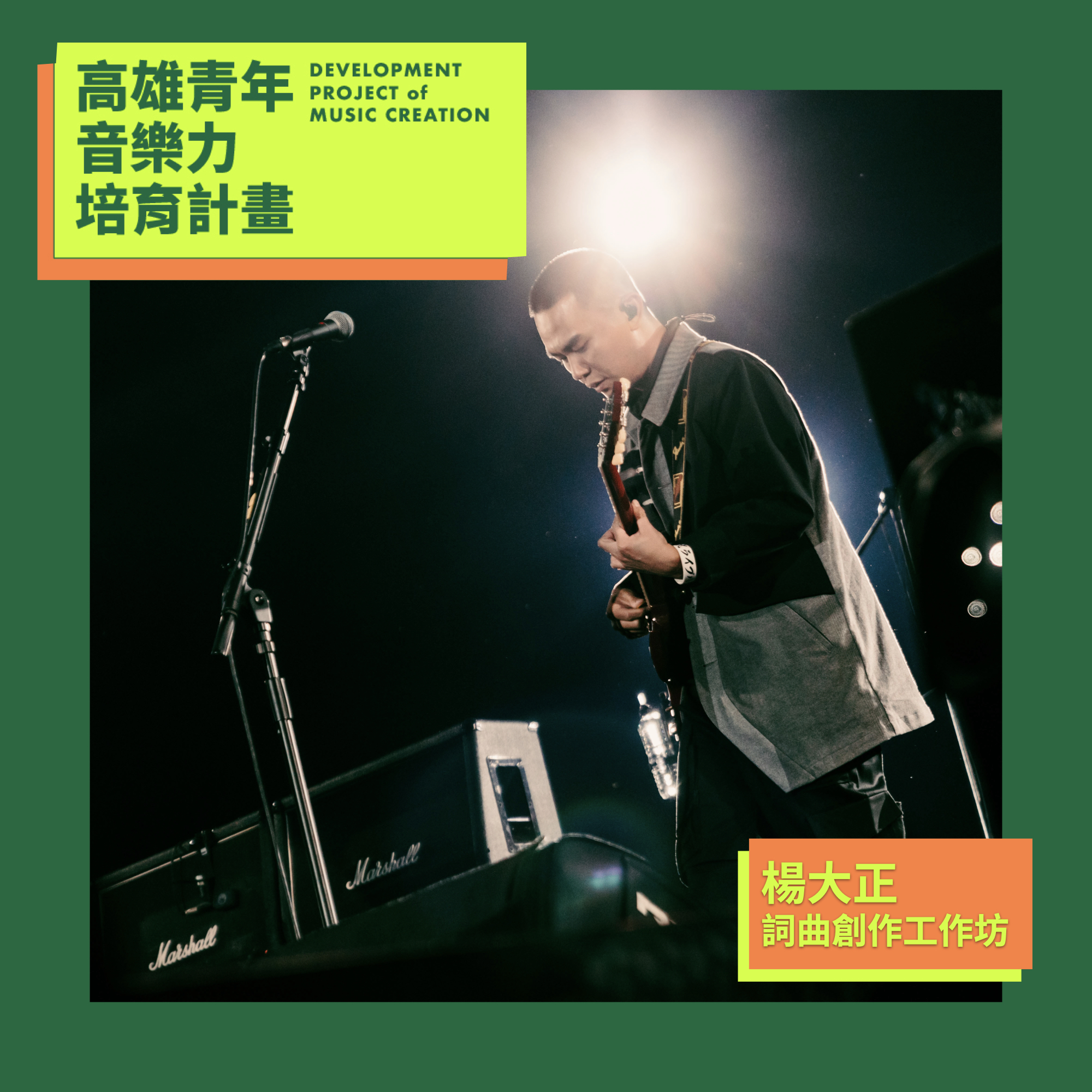 4、課程介紹:由金曲獎得主,滅火器主唱「楊大正」擔任導師,與學員進行線上課程與對談。導師「楊大正」將於8/21(六)進行詞曲創作課程,並給予學員歌曲Demo回饋。第一次課程後,學員需進行Demo調整。九月份課程,主辦單位將替學員分組,與導師進行修改後的作品討論。
