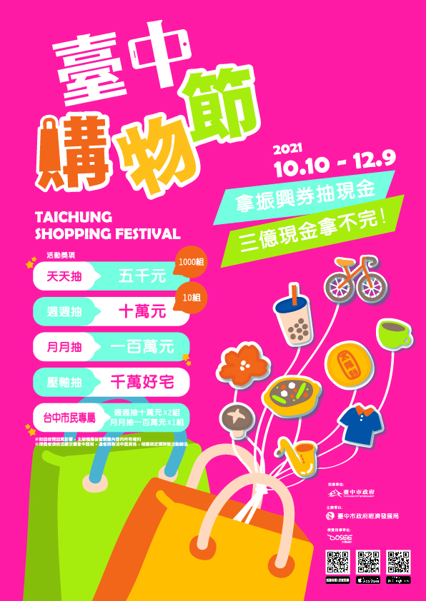 一、 2021年臺中購物節自110年10月10日起至110年12月9日止,祭出天天抽5,000、周周抽10萬、月月抽百萬、壓軸抽精品好宅等多項大獎,活動期間民眾在臺中市內店家消費並下載「臺中購物節App」登錄發票,消費金額每累計滿500元即獲1個抽獎序號;若是到購物節合作優惠店家消費,登錄發票金額以3倍計算,活動詳情請上官方網站:https://funtaichung.tw /2021shopTaichung查詢。