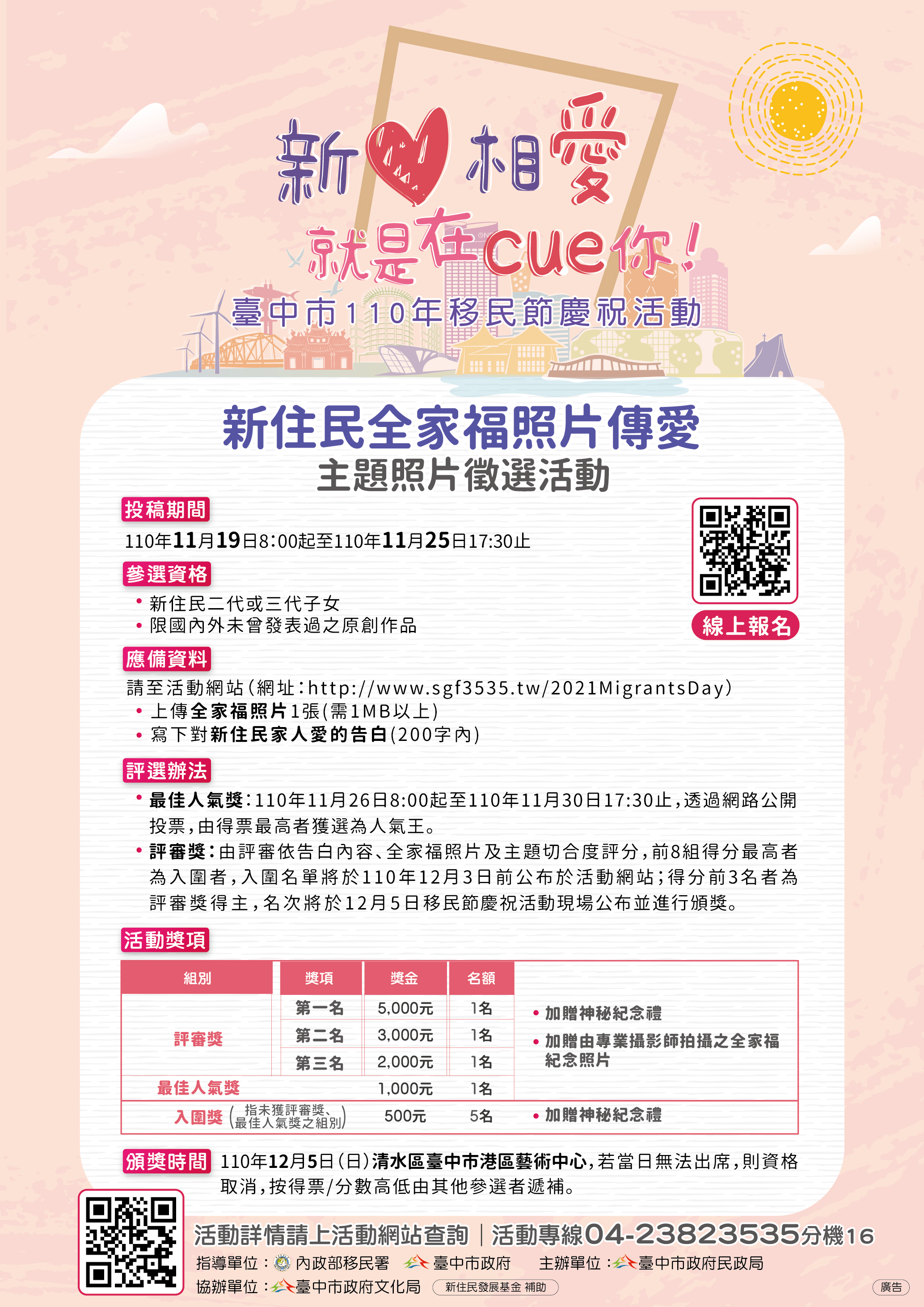 二、 本活動自即日起開放報名至110年11月25日下午5時30分止,報名者需將全家福照片及對新住民家人愛的告白上傳至活動網站(http://www.sgf3535.tw/2021MigrantsDay)始完成報名。甄選作品將於110年11月26日至30日進行網路票選並由評審進行評分,入圍者將於12月5日受邀至清水區港區藝術中心活動現場接受頒獎。