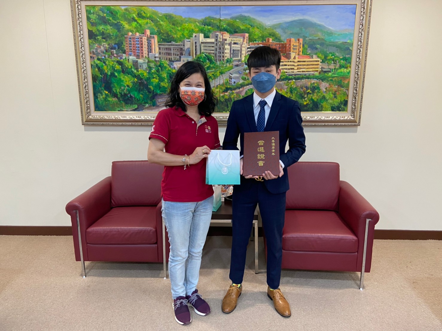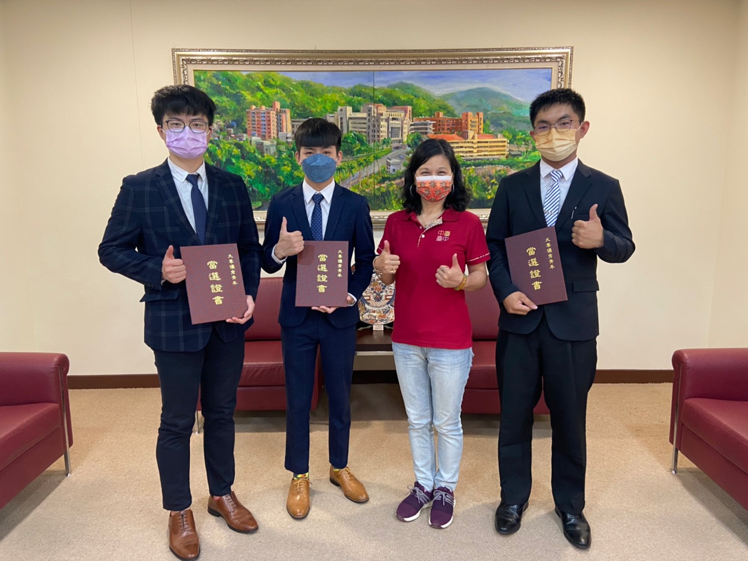 中臺科技大學校長陳錦杏校長對三位同學的傑出表現表示欣慰,希望未來中臺的學生,在精進課業之餘,都能學習如何藉由組織的力量來解決問題,並恭喜三位榮獲今年全國及臺中市優秀青年代表獎殊榮的同學,不僅讓全校師生引以為傲,更讓同學們以其為榜樣。