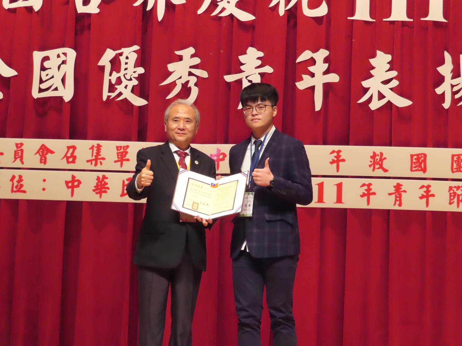 中國青年救國團舉辦「111年青年節全國優秀青年表揚大會」,中臺科技大學資訊管理系四年級劉冠勳同學獲選全國優秀青年代表獎、資訊管理系四年級游睿為同學獲選台中市優秀青年代表獎及行銷管理系四年級劉耿豪同學獲選校內優秀青年代表獎,三位同學在校表現傑出、社團經歷豐富、積極服務及辦理校內活動,各方面表現卓越,堪為全國優秀青年之表率。