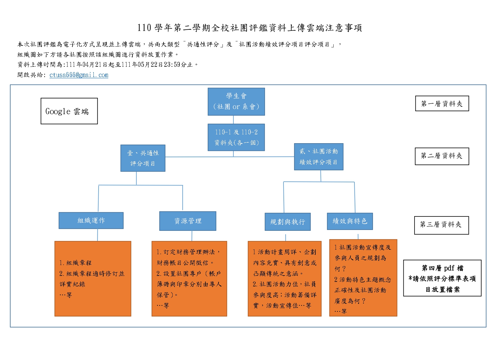 110-2學期學生社團暨自治性組織評鑑活動實施計畫110-2學期全校社團評鑑資料上傳雲端注意事項