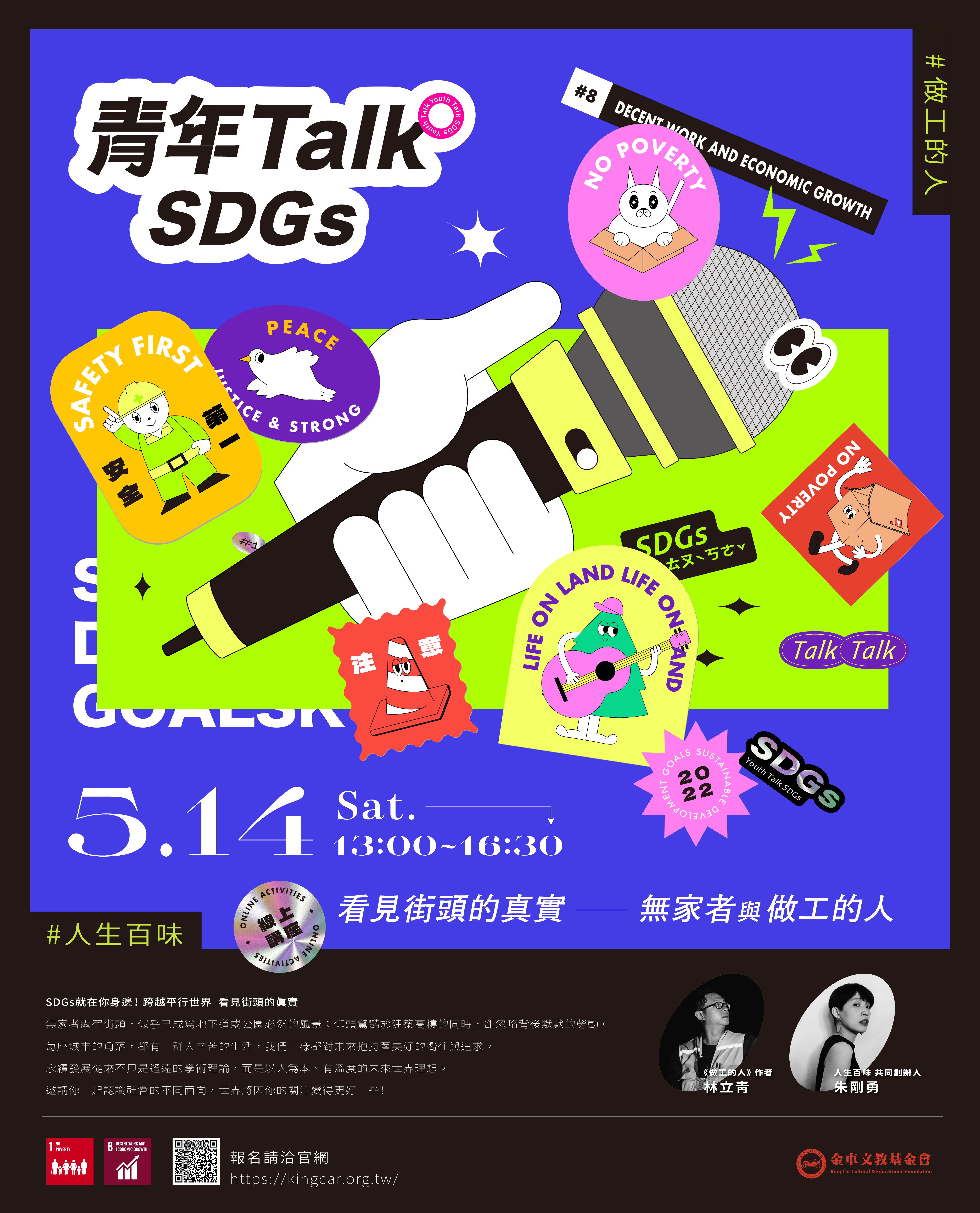 一、金車文教基金會本次邀請到人生百味 共同創辦人朱剛勇,及《做工的人》作家林立青,一起來探討「SDG1 終結貧窮」及「SDG8 體面工作和經濟增長」相關之議題。透過兩位講者的分享與分組交流,期待更多青年朋友能激盪出框架外的想法與行動。