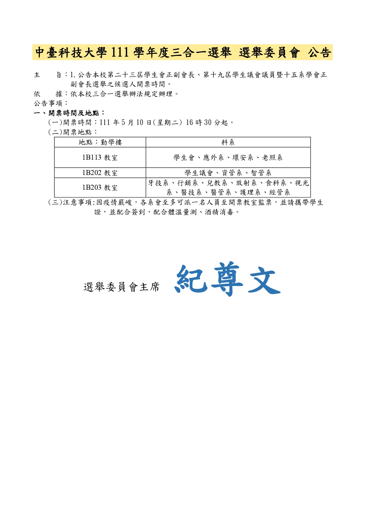 中臺科技大學111學年度三合一選舉 選舉委員會 開票公告