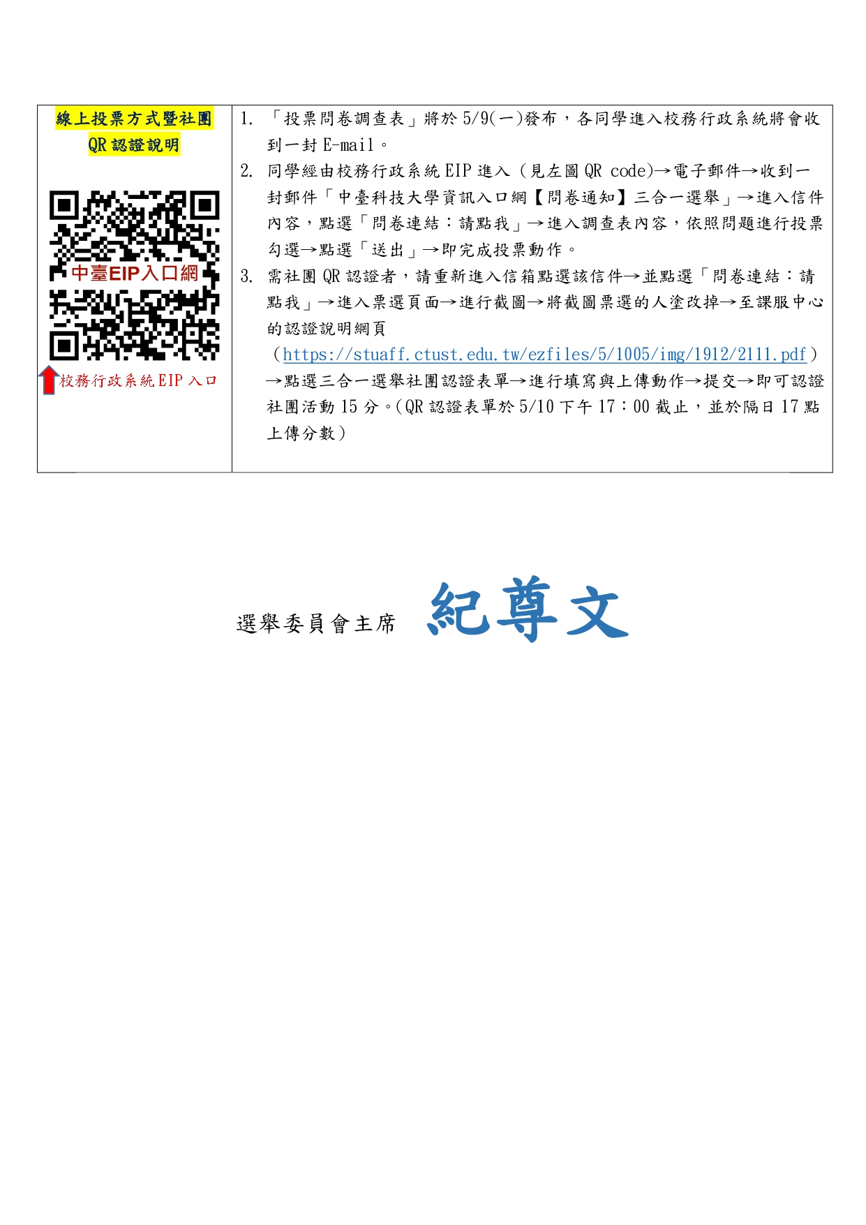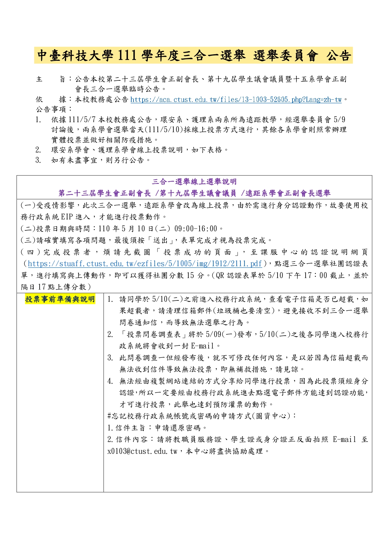 中臺科技大學111學年度三合一選舉 選舉委員會 臨時公告