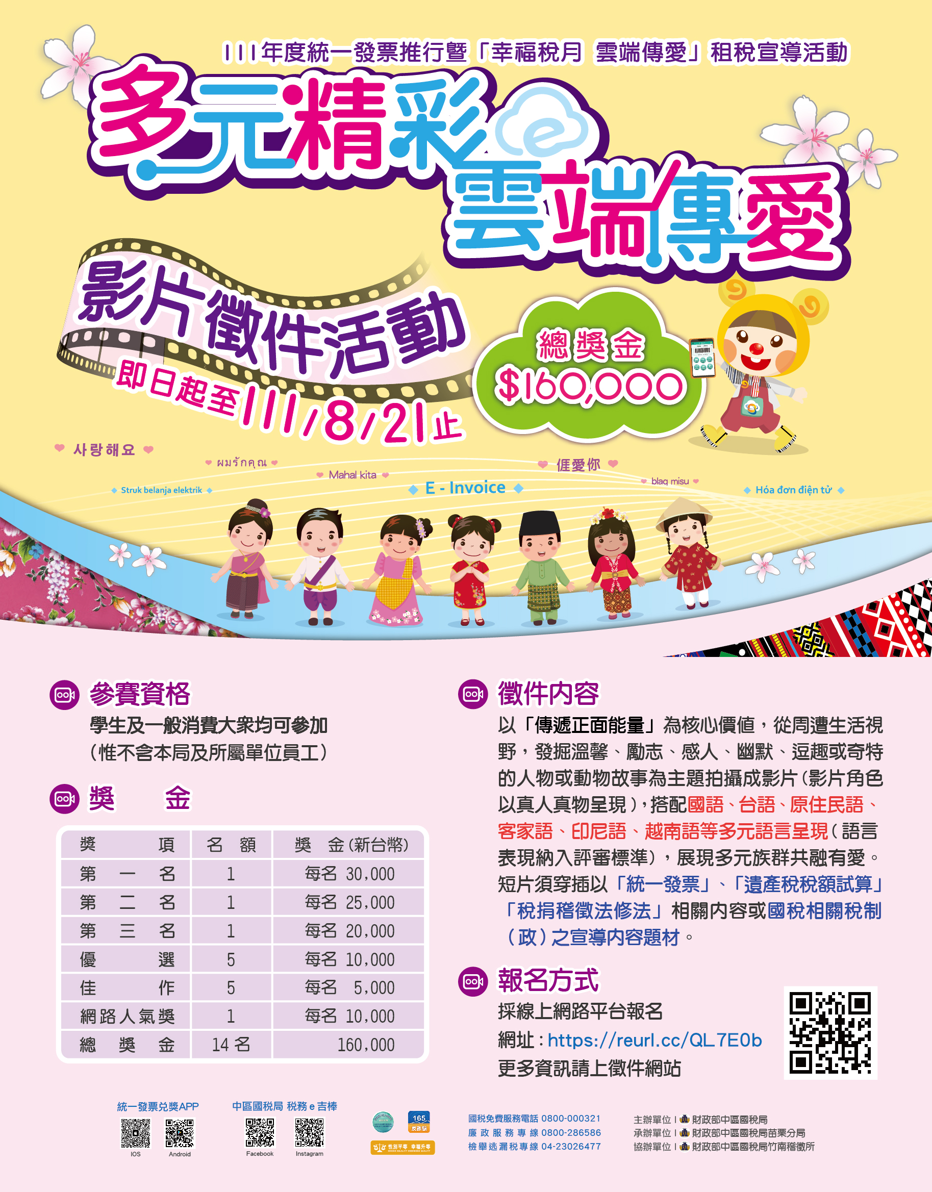一、影片徵件競賽即日起至111年8月21日止,以正面有趣或溫馨感人的方式推廣雲端發票或稅務便民服務,用兩種以上語言呈現,總獎金160,000元。活動詳情請上徵件活動網站https://reurl.cc/QL7E0b或上網搜尋「多元精彩 雲端傳愛」。