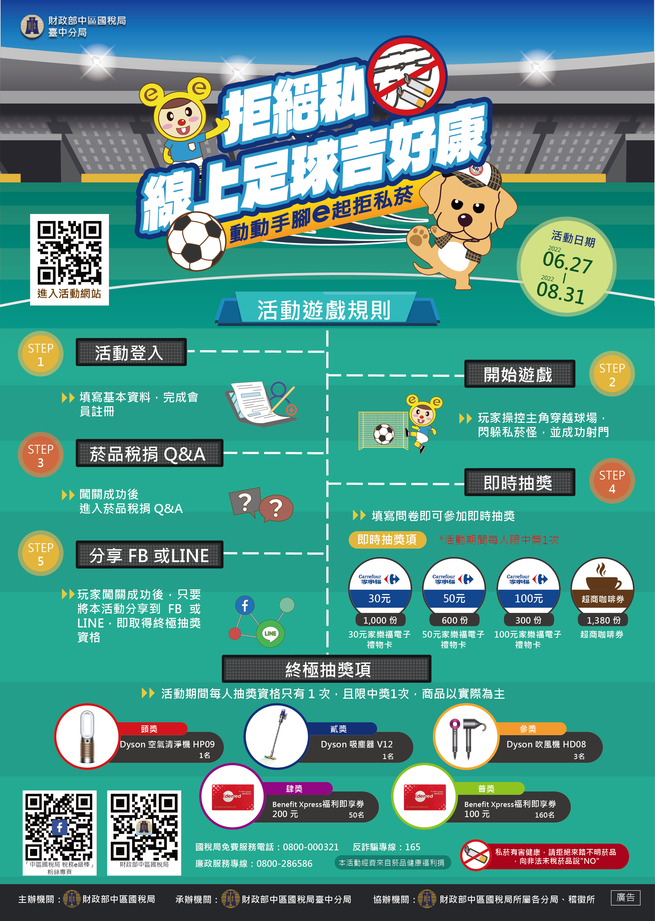 (三)活動方式:登入活動開始遊戲,操控主角穿越球場,閃躲私菸怪,並成功射門即為闖關成功,只要完成菸品稅捐Q&A及活動問卷,即可參加足球闖關遊戲即時抽。再將本活動分享到FB或LINE等社群,還可取得闖關分享終極抽資格。
