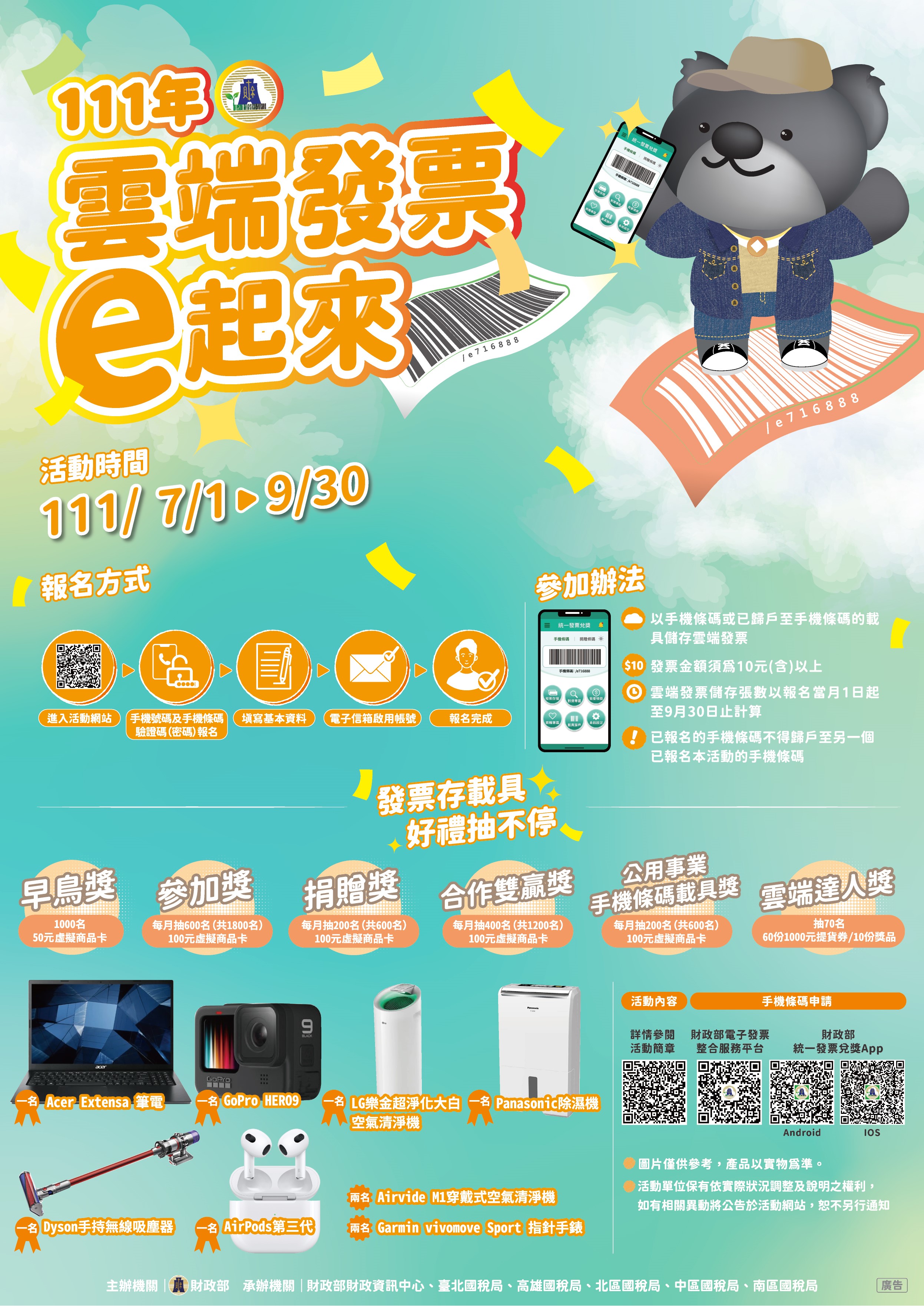旨揭活動自111年7月1日起至111年9月30日止,民眾只需至活動網頁(https://www.einvoice178.nat.gov.tw/)登入手機號碼及手機條碼驗證碼(密碼),並填寫基本資料即可報名,完成指定任務後就有機會獲得Acer Extensa筆電、GoPro HERO9等大獎,詳情請掃描海報上QR Code詳閱相關資訊。