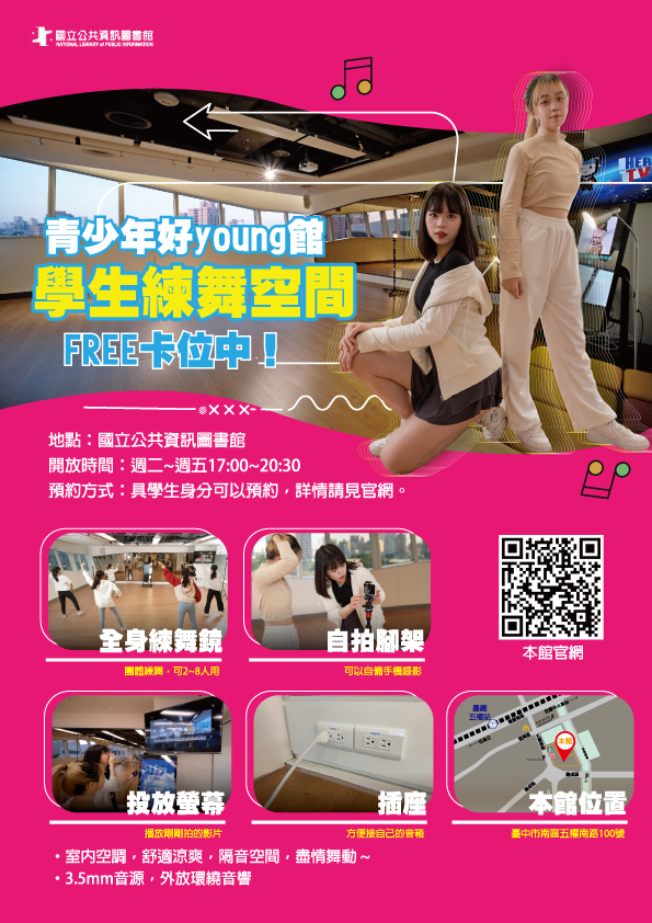 國立公共資訊圖書館青少年好young館空間提供青少年同儕探索學習與互動使用,自即日起試辦練舞空間,具學生身分可預約登記,開放時間及預約辦法詳如海報及官網(https://www.nlpi.edu.tw/ReaderService/FocusArea/Teenager/DanceRoom.htm)。