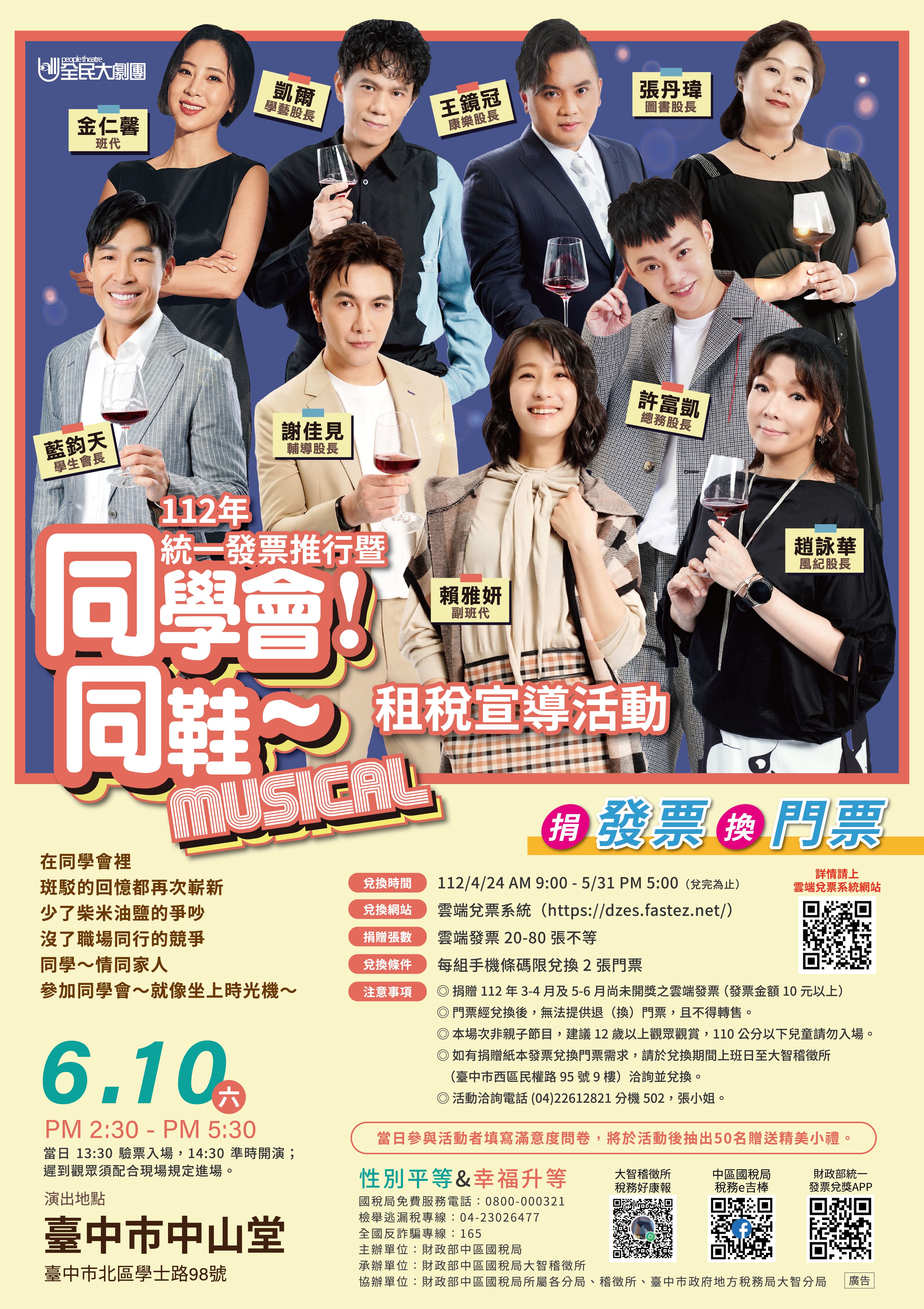 一、 旨揭活動訂於112年6月10日(六)假臺中市中山堂舉辦,門票兌換資訊如下: