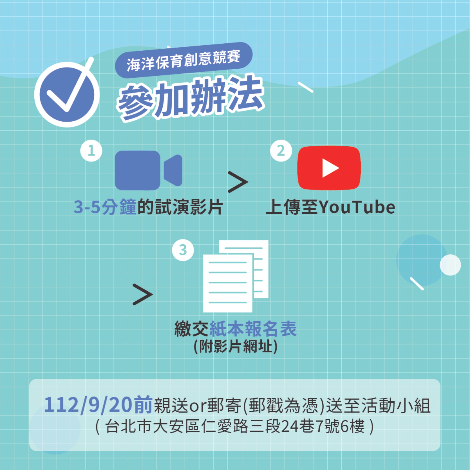 (三)報名方式:本競賽活動以紙本報名,參賽隊伍需自行錄製試演影片,無需表演戲劇完整內容,但需錄製完整表演片段,長度以3-5分鐘為限,並先自行上傳至Youtube平臺後,將網址檢附於紙本報名表中。